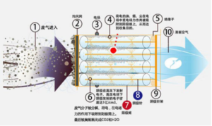 當(dang)外加電(dian)(dian)壓達到氣(qi)(qi)(qi)體(ti)的(de)(de)放電(dian)(dian)電(dian)(dian)壓時,氣(qi)(qi)(qi)體(ti)被擊穿,產(chan)生(sheng)大量(liang)電(dian)(dian)子(zi)、離子(zi)、原子(zi)和自由基在(zai)內(nei)的(de)(de)混合粒(li)子(zi)。這些高能活性(xing)粒(li)子(zi)和廢(fei)(fei)氣(qi)(qi)(qi)中的(de)(de)污染物作(zuo)用,使廢(fei)(fei)氣(qi)(qi)(qi)分(fen)子(zi)在(zai)極短的(de)(de)時間內(nei)發(fa)生(sheng)分(fen)解,以達到凈化(hua)廢(fei)(fei)氣(qi)(qi)(qi)的(de)(de)目的(de)(de)。電(dian)(dian)場的(de)(de)設(she)計使廢(fei)(fei)氣(qi)(qi)(qi)分(fen)子(zi)的(de)(de)運(yun)動(dong)速度(du)較低,零點幾秒內(nei)便(bian)能使其負載足夠的(de)(de)電(dian)(dian)荷(he)。帶電(dian)(dian)粒(li)子(zi)在(zai)電(dian)(dian)場中會受到電(dian)(dian)場力(li)(庫(ku)侖力(li))的(de)(de)作(zuo)用,使廢(fei)(fei)氣(qi)(qi)(qi)分(fen)子(zi)被吸附至陽極,因此凈化(hua)率(lv)非(fei)常高。粒(li)子(zi)電(dian)(dian)離后(hou)產(chan)生(sheng)的(de)(de)電(dian)(dian)子(zi)平均能量(liang)約為1eV~10eV,因此(ci)控制反應(ying)條件可以使反應(ying)變(bian)得十分快(kuai)速。